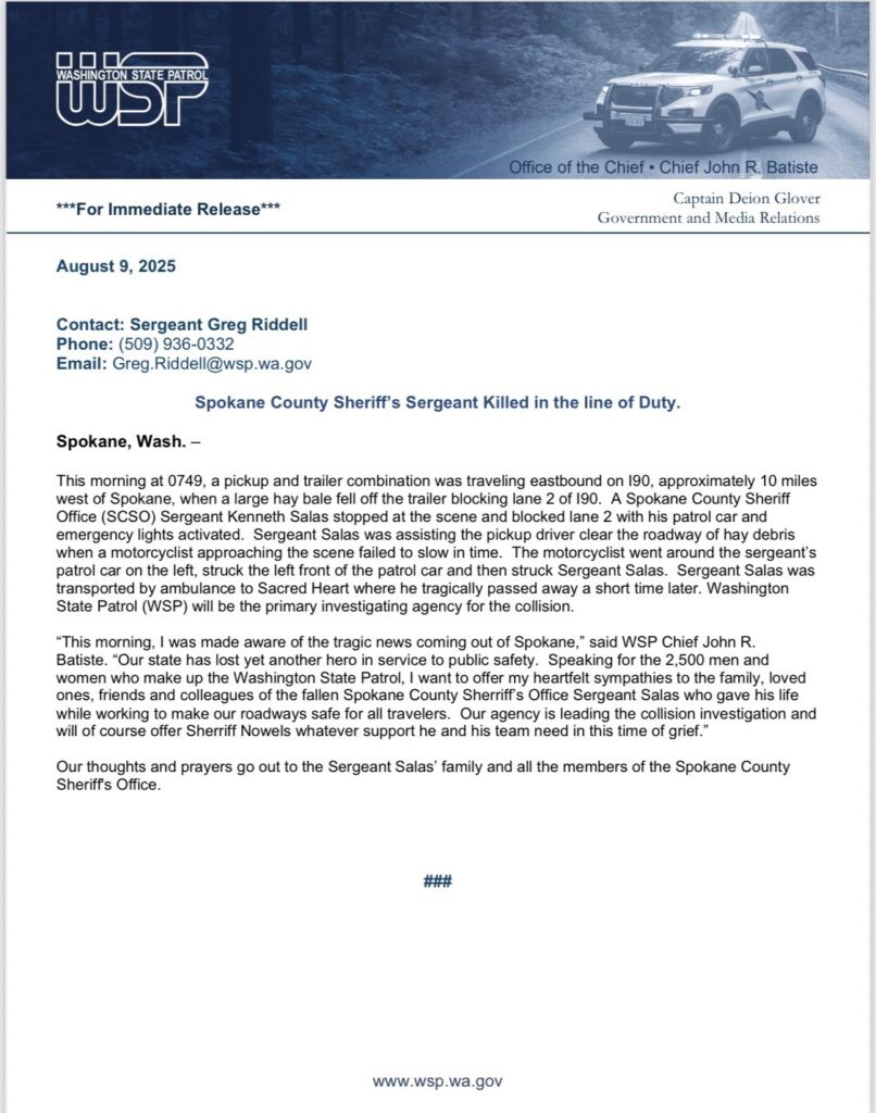 El Sargento Kenneth Salas, de 59 años, del Departamento del Sheriff del Condado de Spokane, murió el 9 de agosto de 2025 mientras realizaba un acto de servicio: retiraba una paca de heno caída en la vía. Según el sheriff John Nowels, Salas planeaba retirarse el próximo mes y le quedaban 30 turnos de trabajo antes de su jubilación.