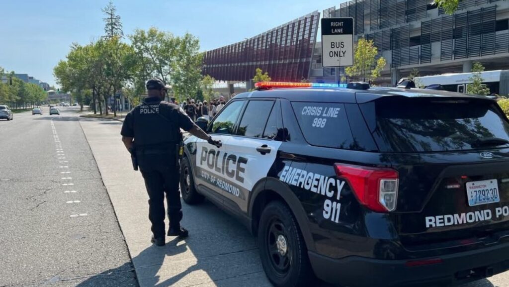 El Departamento de Policía de Redmond informó que el lunes 26 de agosto, alrededor de la 1:00 p.m., los oficiales respondieron a un reporte sobre un grupo de manifestantes reunidos en la acera del campus de Microsoft.
