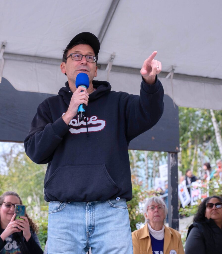 Entre los oradores estuvieron la congresista Pramila Jayapal y el presidente del concejo del condado King, Girmay Zahilay. Ellos resaltaron la importancia de proteger la democracia y los programas sociales.