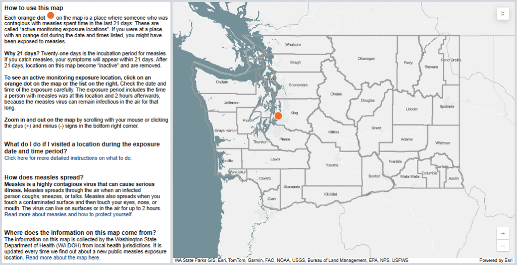 El Departamento de Salud de Washington lanzó una herramienta digital que muestra los lugares donde personas infectadas con sarampión estuvieron recientemente, con el fin de ayudar a prevenir nuevos contagios.