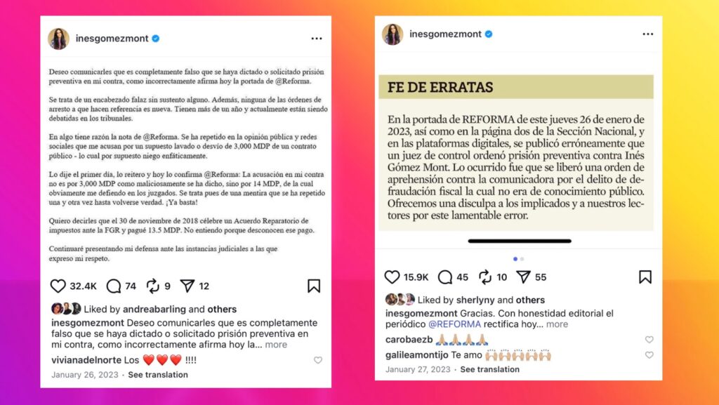 Capturas de pantallas de dos de las publicaciones que publicó Gómez Mont en su instagram.