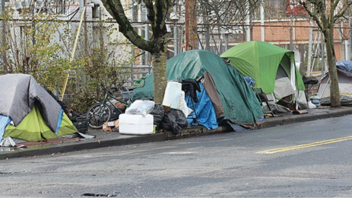 La ley de “no sentarse, no acostarse” fue aprobada por primera vez en 2021, restringiendo los campamentos de personas sin hogar en un radio de 10 cuadras a lo largo de Smith Avenue, cerca del paso elevado de la autopista I-5.