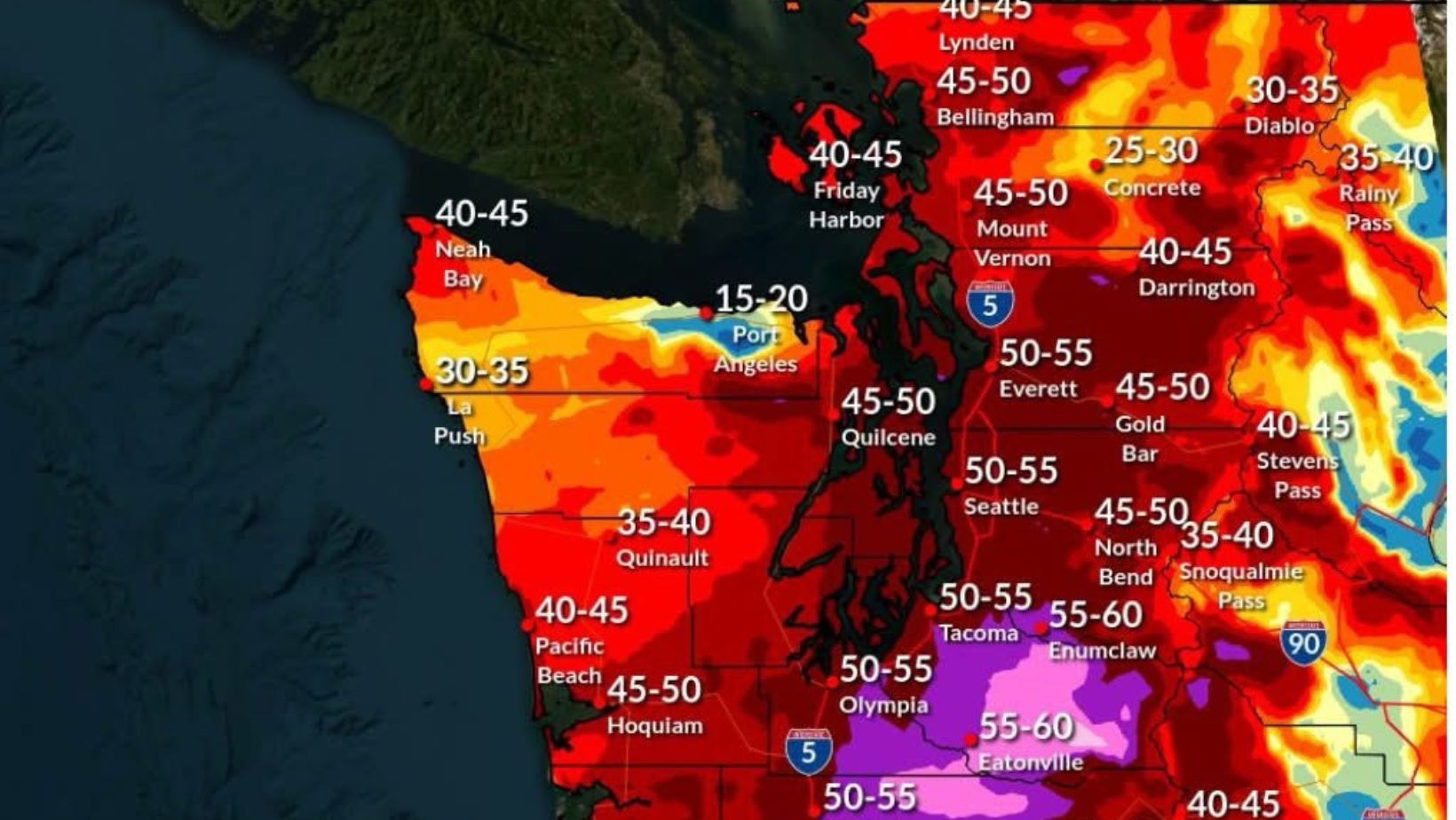 De acuerdo con el NWS Seattle, el sistema de baja presión que se desplazará por la costa traerá ráfagas significativas entre las 12:00 p. m. y las 5:00 p. m. Las estimaciones muestran valores entre 50 y 55 mph en ciudades como Seattle, Everett, Tacoma, Olympia y Mount Vernon, mientras que algunas zonas del Condado Pierce podrían experimentar ráfagas de hasta 60 mph. En áreas con suelo saturado, este cambio repentino de viento aumenta la posibilidad de caída de árboles y daños en líneas eléctricas.