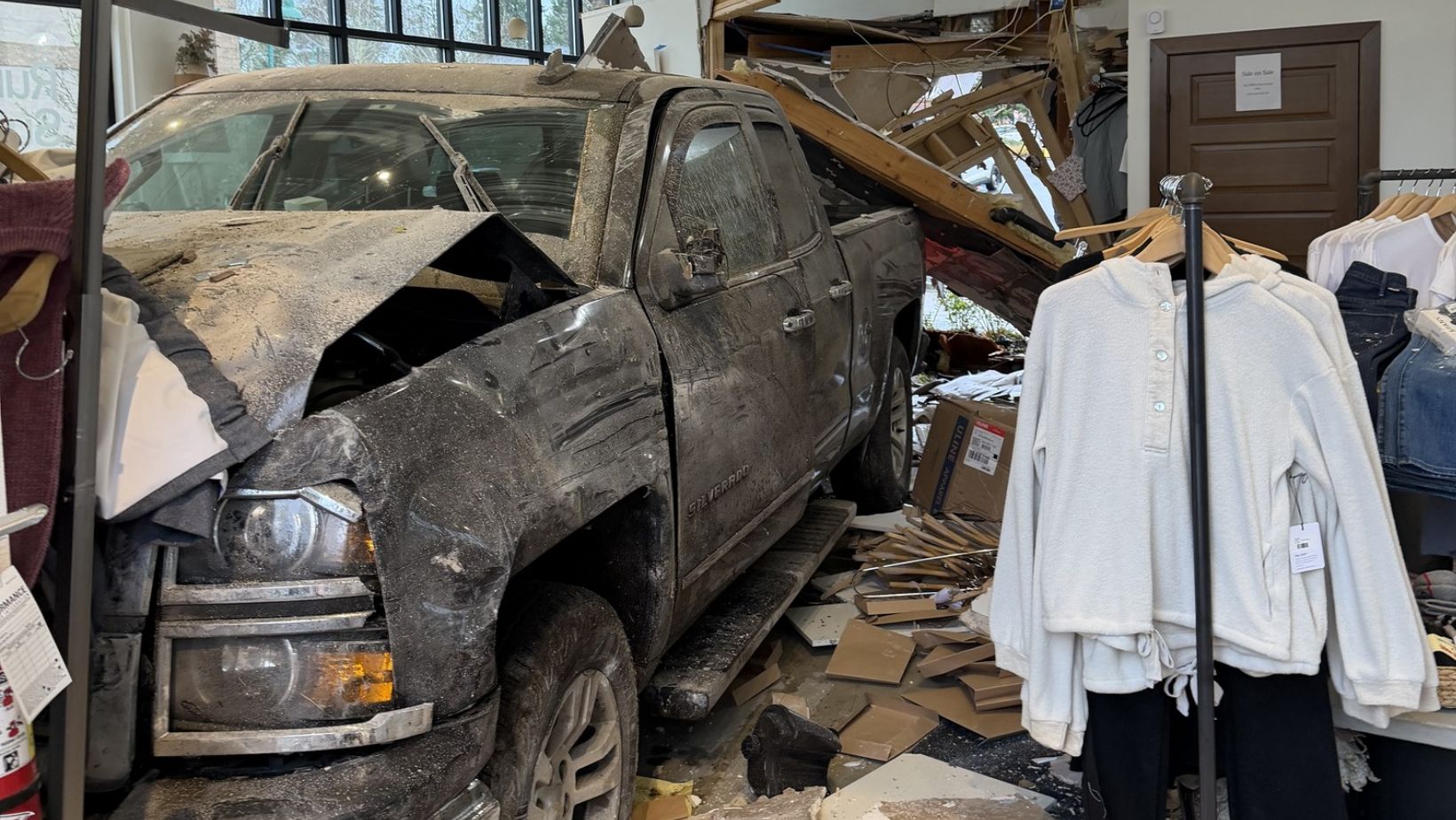 La camioneta impactó primero una señal de alto, luego un vehículo estacionado, cruzó la acera y finalmente chocó contra la pared del negocio.