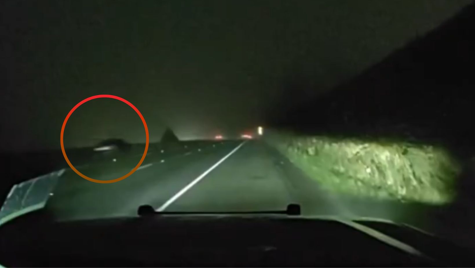 Un breve segmento de la cámara del tablero captó al auto al pasar a gran velocidad. Luego, el conductor se perdió rápidamente entre la niebla.