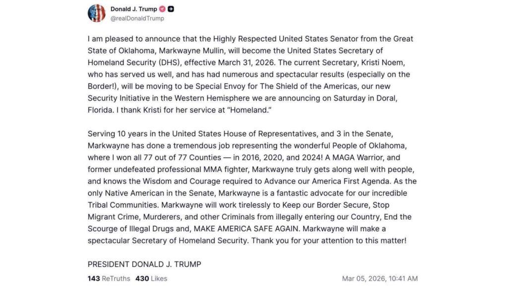 Tras la destitución, Donald Trump anunció que nominará al senador republicano Markwayne Mullin, de Oklahoma, para dirigir el Departamento de Seguridad Nacional.