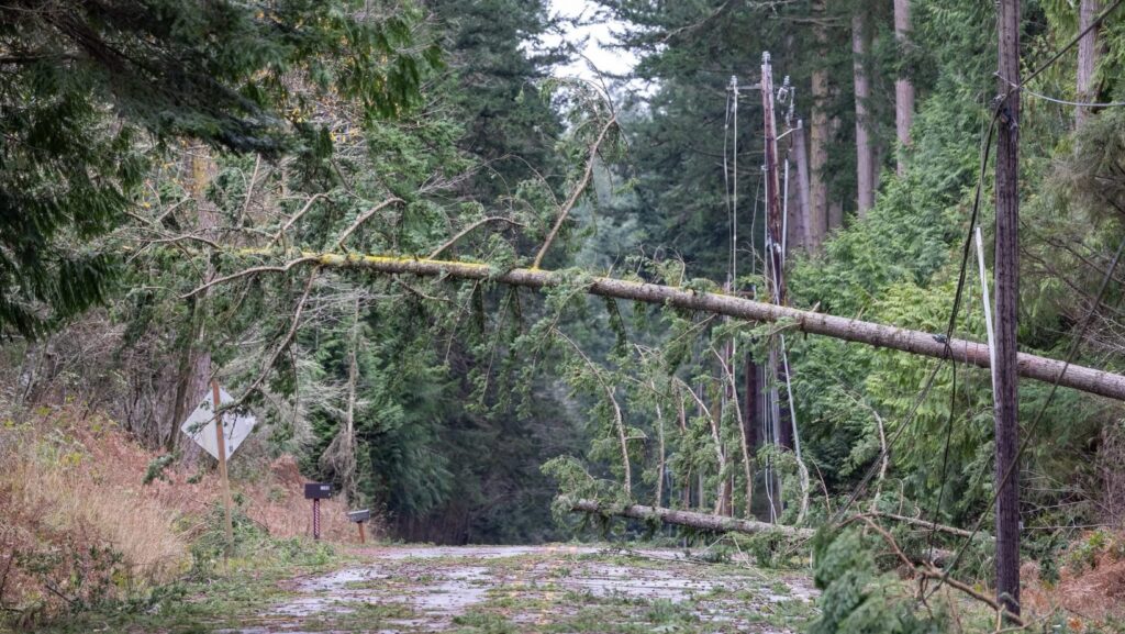 Según Snohomish County PUD, los árboles debilitados por el suelo húmedo pueden caer sobre líneas eléctricas, lo que provoca una parte significativa de los apagones en la región.