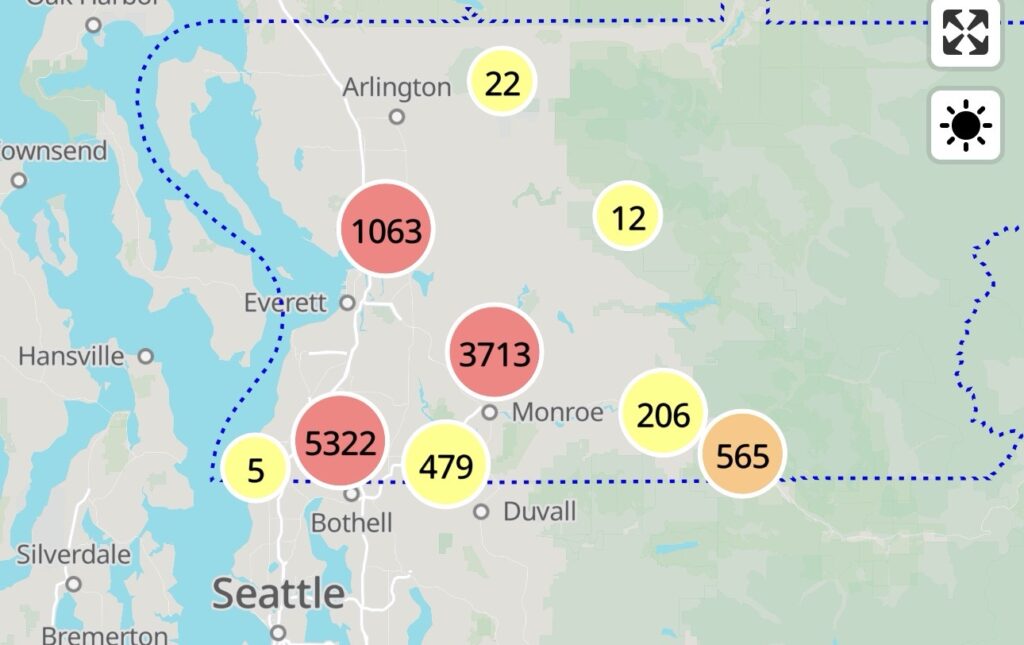 Los residentes pueden revisar el estado del suministro eléctrico en el mapa de interrupciones de Snohomish County PUD.